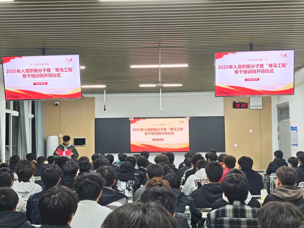 (通讯员 张领)为落实立德树人根本任务,加强大学生思想政治引领,10月29日晚,汽车工程学院在5504教室举行“青马工程”暨入党积极分子培训班开班仪式。学院党总支书记李霞、副书记李路、专职组织员梁军萍、学生党支部书记张琦、分团委书记曲杉出席,110名入党积极分子、入团积极分子及2025级团学骨干参加。