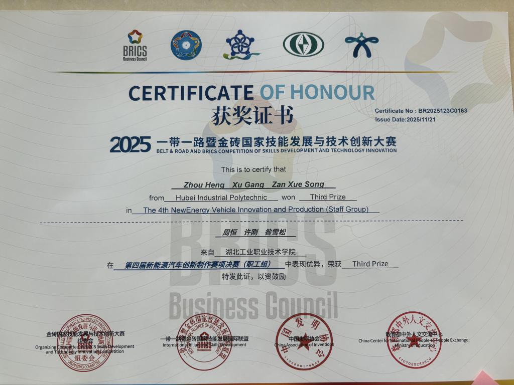 (通讯员:周恒)近日,在山东省济南市举办的2025一带一路暨金砖国家技能发展与技术创新大赛第四届新能源汽车创新制作赛项决赛圆满落幕。由我校汽车工程学院周恒、许刚、昝雪松三位教师组成的参赛队伍在全国众多参赛队伍中凭借扎实的专业技能和稳定的临场发挥脱颖而出,获得教师组三等奖。