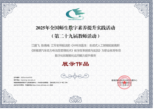 (通讯员高燕)在刚刚结束的2025年全国师生数字素养提升实践活动职业教育专项评选活动中,我校报送的案例成功入选“职业教育数字化和智能化应用能力提升案例展示作品”。此次活动图文信息中心积极组织,共征集3个案例,其中江鹏飞、陈高峰、江军三位教师共同完成的《AI电池医生:生成式人工智能赋能高职〈新能源汽车动力电池及管理技术〉教学改革探索与实践》获评为展示作品。这一成果不仅是对我校一线教师数字化教学创新能力的权威认可,更是学校深入贯彻国家教育数字化战略、推动“数智融合”在职业教育领域落地生根的生动实践。
