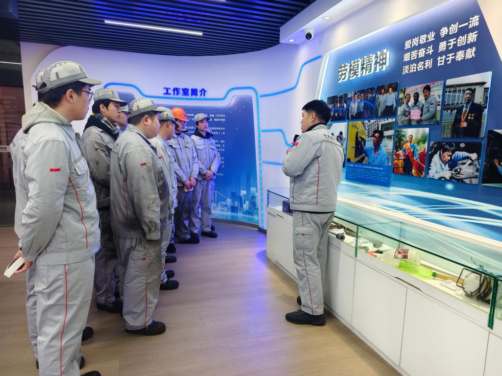 表彰大会后,企业组织学生走进王涛技能大师(劳模)创新工作室开展沉浸式学习。“专注、精益、创新、高效” 的八字标语醒目亮眼,陈列架上的国家级创新成果证书、自主研发工具、技术攻关手稿等,承载着劳模团队数十载的坚守与突破。企业技术骨干结合案例,详解团队优化工艺、攻克技术瓶颈的奋斗历程,让同学们直观感受工匠精神的内涵。大家纷纷表示,将以劳模为榜样,在专业道路上脚踏实地、追求极致。