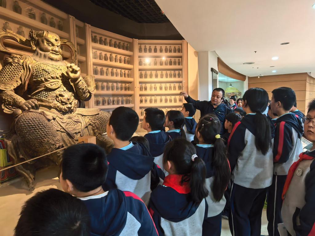 上午9 时,师生们有序抵达武当山博物馆,在讲解员与张勇老师的共同引导下,依次参观建筑艺术、道教造像、武当非遗等核心展区。从珍贵历史文物到特色非遗展品,从武当建筑营造智慧到特色文化人文内涵,张勇老师结合专业知识,用通俗易懂的语言解读文物背后的科学原理与文化故事,让传统文化与科普知识相互交融、生动呈现。同学们认真聆听、细致观察,不时举手提问,在互动交流中深化对武当文化的认知。